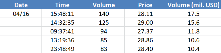 Největší obchody podle objemu na Brent (aktivní future kontrakt)