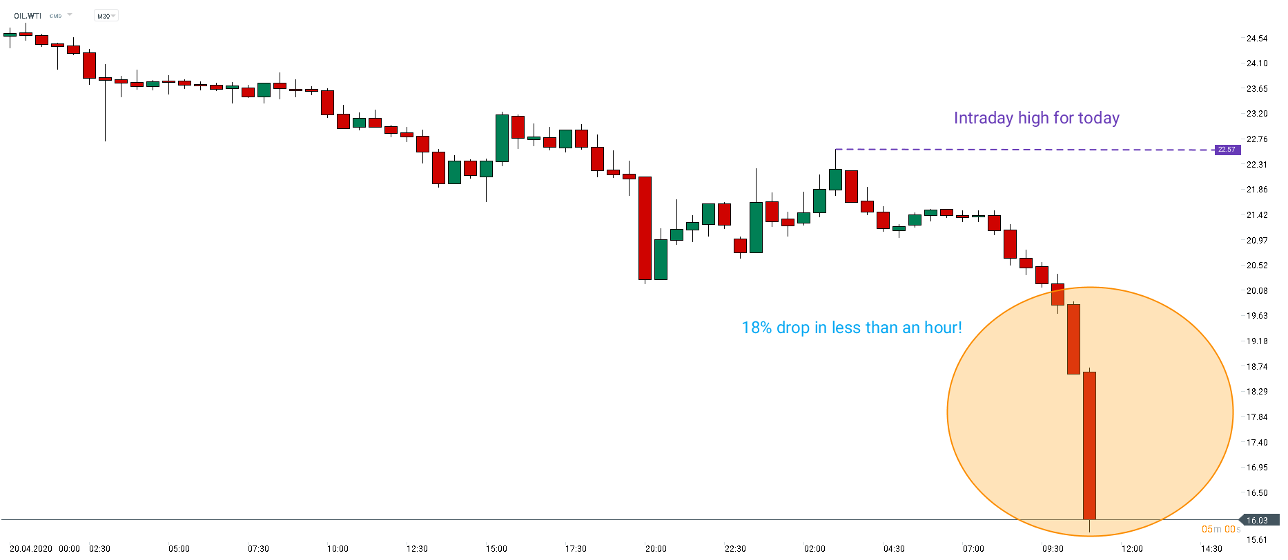 Trh s ropou dnes pokračuje v propadu. Jen den poté, co aktuální květnový futures kontrakt poklesl o více než 300 %, více aktivní červnový kontrakt padá o třetinu! OIL.WTI propadl až pod úroveň 12 dolarů za barel. Ropa Brent klesla pod 19 dolarů poprvé od roku 2002. Pokles se projevuje také na akciových trzích. Hlavní evropské indexy i futures na americké indexy se nacházejí v negativním teritoriu. Německý DAX ztrácí téměř 2 %.