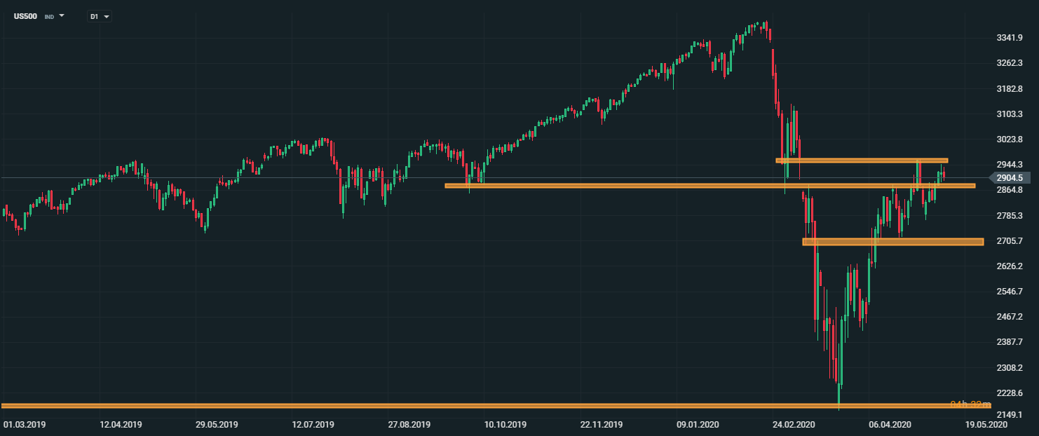 Americký akciový index US500 dnes pokračuje v obchodovaní v pásme medzi 2950 a 2900 bodmi. V prípade, ak by cena dokázala uzavrieť pod úrovňou 2870 bodov, otvorí sa priestor pre dodatočný pokles k úrovni 2700 bodov. Ďalšie smerovanie na trhoch bude už tradične najviac ovplyvnené vývojom pandémie a uvoľňovania blokovacích opatrení. Zdroj: xStation5
