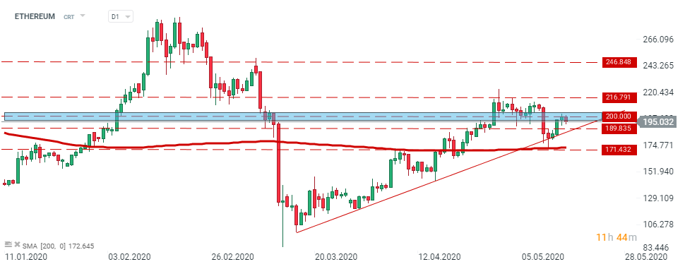 Ethereum sa obchoduje v rastovom trende. Cena sa však nedokázala udržať nad kľúčovou úrovňou 200 USD. Ak prevládne negatívna nálada, cena môže klesnúť k supportu na úrovni 189,83 dolárov. Na druhej strane, v prípade, že by býky získali kontrolu a dokázali tlačiť cenu nad psychologickú úroveň 200,00 dolárov, potom môže byť ďalším potenciálnym cieľom kupujúcich odpor na hladine 216,79 dolárov. Zdroj: xStation5