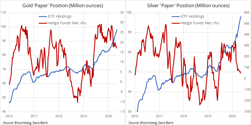Pokud jde o takzvanou papírovou poptávku po drahých kovech, došlo k zásadnímu rozkolu mezi taktizujícími obchodními firmami, které sledují momentum, mezi něž patří i většina hedgových fondů, a dlouhodobějšími investory, ať už drobnými nebo institučními, kteří využívají fondy ETF orientované na stříbro a zlato. COT (Commitments of Traders) report za týden končící 5. květnem ukázal, že hedgové fondy, vyděšené téměř 40% propadem od února do poloviny března, omezily od února býčí sázky na stříbro o 85 %, takže se ocitly na jedenáctiměsíčním minimu. Investoři do ETF naopak až na drobné březnové zakolísání stříbrné ETF od ledna stále nakupují. Celková držba už dosáhla rekordních 98 milionů uncí. Stejný vývoj je možné pozorovat i u zlata, kde držba ze strany ETF dosahuje nových rekordních maxim, zatímco hedgové fondy omezily své čisté dlouhé pozice ve futures na jedenáctiměsíční minimum.
