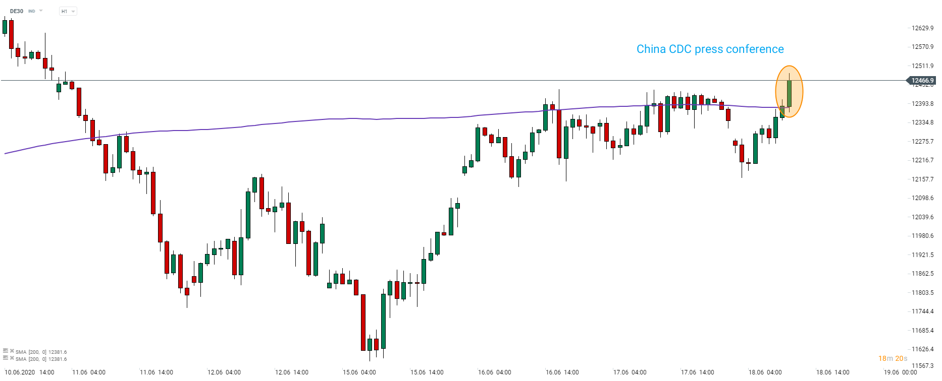 Európske akciové indexy a futures na Wall Street zaznamenali nárast počas tlačovej konferencie čínskych úradníkov CDC. Wu Zunyou, expert na vírusy z čínskeho CDC povedal, že nové ohnisko koronavírusu v Pekingu je zatiaľ pod kontrolou. DE30 a US500 po týchto správach zaznamenali nárast o 0,6%. Nie je však známe, či Peking zruší rozhodnutie zatvoriť školy, alebo zrušiť lety. -