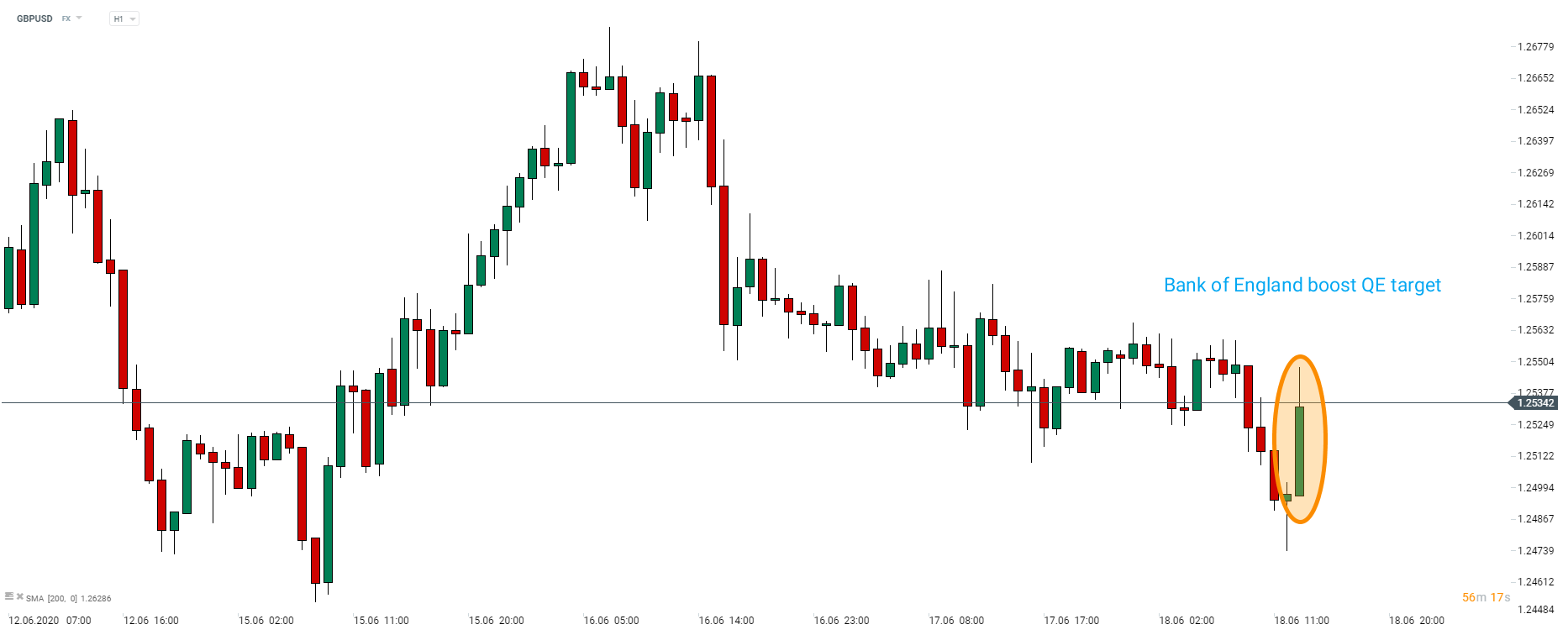 Bank of England oznámila o 13:00 svoje posledné rozhodnutie. Banka ponechala sadzby nezmenené podľa očakávania, rozhodla sa však zvýšiť cieľ pre nákupy dlhopisov o 100 miliárd GBP na 745 miliárd GBP. O tomto kroku sa hovorilo niekoľko dní, no aj napriek tomu zaznamenala libra nárast. Menový pár GBPUSD zaznamenal po zverejnení pokles o 0,4%. Banka tiež uviedla, že je pripravená konať v prípade, že ekonomika bude potrebovať pomoc.
