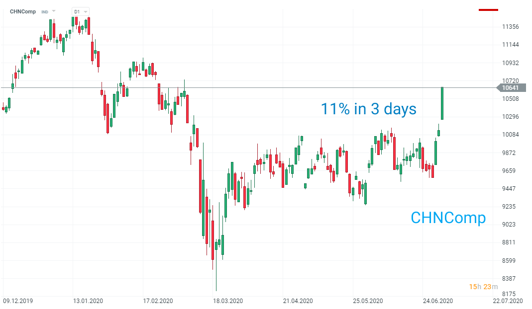 Hlavné akciové indexy začali nový obchodný týždeň výrazným rastom. Čínske indexy (vrátane CHNComp) bez špecifického katalyzátora narástli o približne 5% po správach v štátnych médiach, že hospodárstvo teraz potrebuje „zdravý býčí trh“. Investori to jednoznačne interpretovali ako štátnu intervenciu, čo podporilo náladu na trhoch. Dôsledkom toho boli nárasty US2000 o 2,8%, US 1,8%, DE30 a US100 1,5%. Investori sa rozhodli ignorovať nové obmedzenia týkajúce sa COVID v Austrálii a Španielsku.
