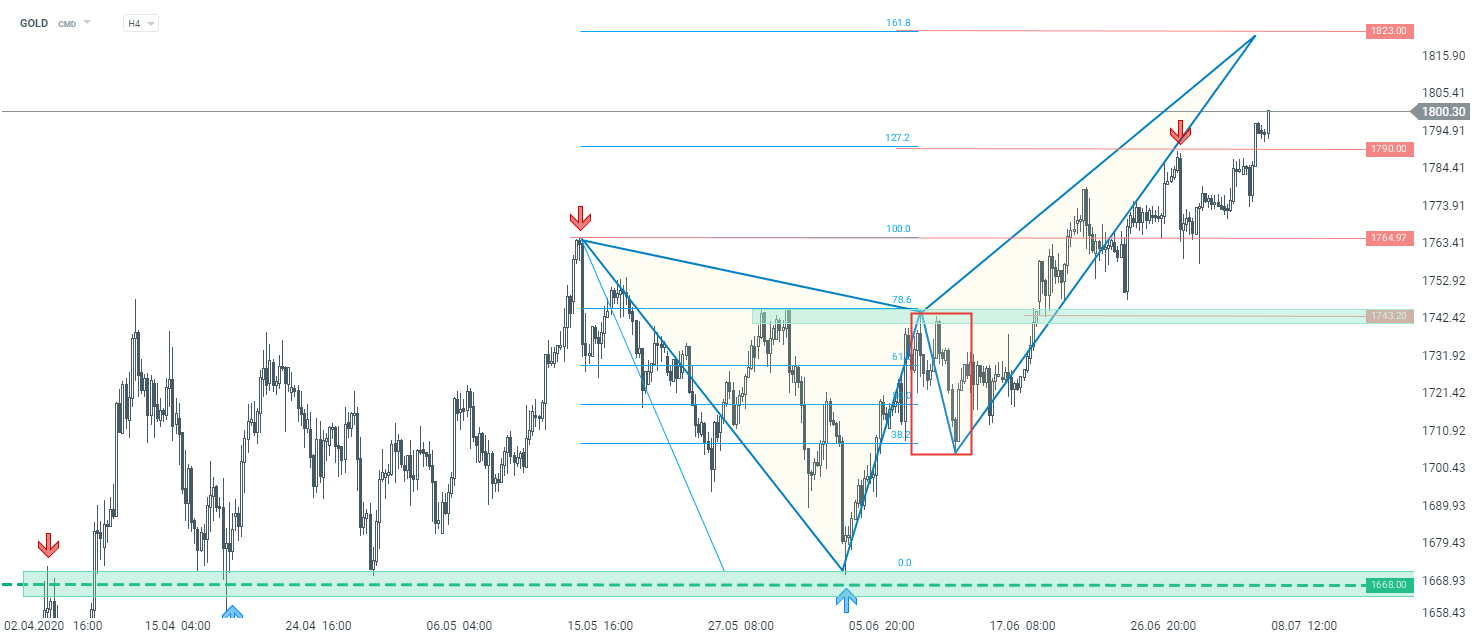 Zlato sa obchoduje už dlhší čas v rastovom trende. Počas dnešného obchodovania zaznamenala cena pomerne prudký nárast a dostala sa na nové tohtoročné maximá. Hlavný trend ostáva rastový. Z technického hľadiska sa na grafe vytvára potenciálny harmonický vzor XABCD. Cena sa dostala nad 127,2% Fibonacciho retracement, pričom môže ďalej pokračovať v pohybe smerom nahor až k 161,8% Fibonacciho retracementu. Úroveň 1823 dolárov predstavuje kľúčovú úroveň odporu. V prípade korekcie smerom nadol sa nachádza najbližšia úroveň podpory na hladine 1798 dolárov. V prípade, ak by cena klesla pod túto úroveň, otvorí sa priestor na pokles k ďalším úrovniam podpory, ktoré sa nachádzajú na hladinách 1765 USD a 1743 USD.