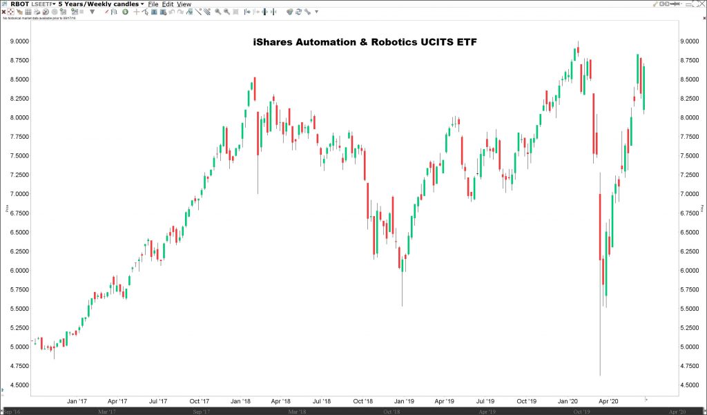 IShares Automation & Robotics UCITS ETF sleduje index iSTOXX® FactSet Automation & Robotics. Tento index se skládá ze společností na rozvinutých a rozvíjejících se trzích, které realizují významné tržby v konkrétních odvětvích spojených s vývojem automatizační a robotické technologie. ETF se obchoduje v dolarech, ale je kótována v Irsku (Evropa), takže evropští investoři mohou také obchodovat s tímto ETF.