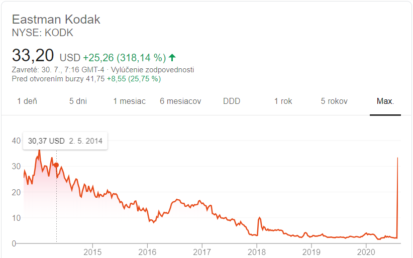 Eastman Kodak, někdejší lídr na trhu fotografických potřeb, přesedlal na výrobu složek generických léků, které bude možné nasadit při léčbě nemoci covid-19. Společnost na to dostala od americké vlády, která tak chce snížit závislost na zahraničních dodávkách, půjčku 765 milionů dolarů (17 miliard Kč). Akcie Kodaku ve středu reagovaly strmým růstem až o 570 procent. -