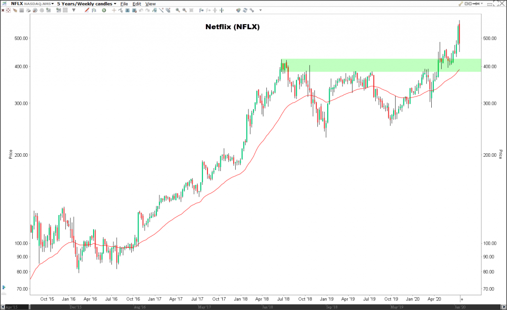 Cena akcií společnosti Netflix (ISIN: US64110L1061– symbol: NFLX– měna: USD) v posledních měsících prudce vzrostla.14. července byla cena nad 570 USD za akcii.Mezitím již sazba klesla téměř o 20%.Silná podpůrná zóna se pohybuje kolem 400 $ / 430 $. Netflix tam v posledních letech čelil odporu, ale v dubnu ji streamingový gigant dokázal prorazit.Tento bývalý odpor nyní může fungovat jako podpora a investoři zde mohou zažít zajímavé úrovně vstupu.