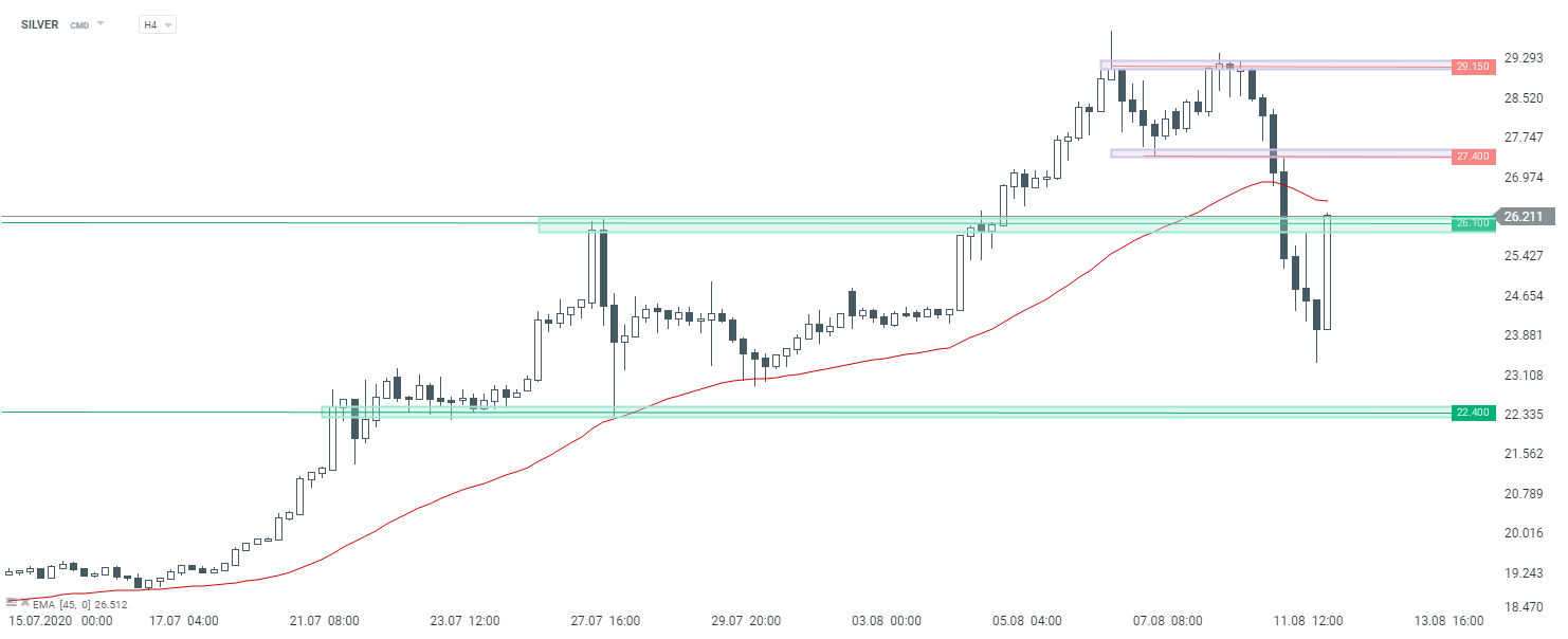 Ceny drahých kovů byly v poslední době velmi volatilní. Po silném výprodeji spojeném se šířením koronaviru začalo stříbro rally. Nicméně rostoucí momentum se vytratilo poté, co cena stříbra dosáhla na čerstvá letošní maxima. Cena jen v úterý propadla o více než 10 %. Středeční seanci začalo stříbro na negativní vlně, ale následně přišel silný tlak na korekci. Při pohledu na graf je zřetelný proražený support na 26,10 dolarech, který nyní slouží jako hlavní rezistence. Pokud se cena udrží pod touto úrovní, tak by se mohla obnovit klesající korekce. Na druhou stranu by průraz znamenal silnější rostoucí impuls.