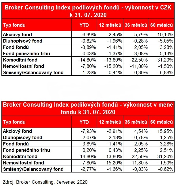 V červenci výkonnost některých skupin podílových fondů stále zůstávala hluboko pod nulou. Dluhopisové a peněžní fondy se v minulosti těšily skutečnosti, že nesly svým investorům od začátku roku kladné zhodnocení, ovšem v červenci si právě tyto dvě skupiny připsaly pokles. Dluhopisové fondy měly v červenci výkonnost -0,82 %, v červnu 1,40 % a peněžní fondy vykazují výkonnost mírně pod hranicí nuly, a to -0,03 %, pro připomenutí v červnu si připisovaly 4,30 % a vykazovaly tak nejvyšší výkonnosti od začátku roku ze všech skupin podílových fondů. Vyplývá to z Broker Consulting Indexu podílových fondů za červenec 2020.