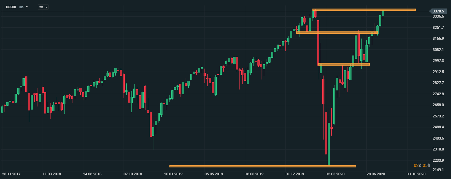 Americký akciový index US500 sa obchoduje v blízkosti historicky najvyšších úrovní. V prípade, ak bude na trhoch prevládať pozitívna nálada, akciový index sa môže dostať do nezmapovaných vôd. Zdroj: xStation5
