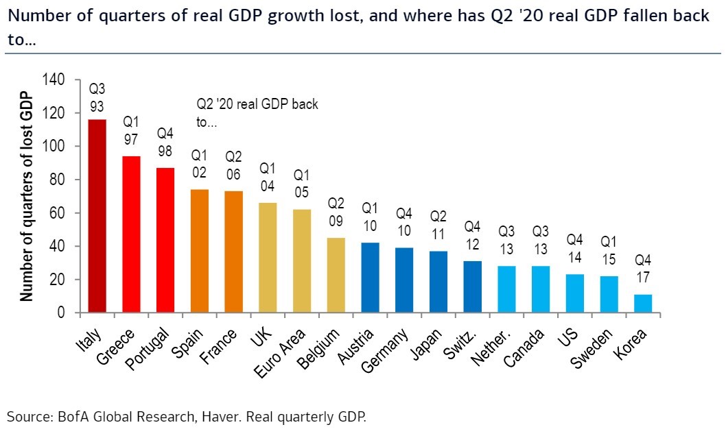 Bank of America vytvořila vynikající graf, který ukazuje, kolik kvartálů růstu HDP bylo ztraceno kvůli recesi způsobené globální pandemií Covid-19. V některých případech jsou poklesy reálného ekonomického výstupu stěží uvěřitelné. Například Itálie ztratila téměř 120 kvartálů růstu HDP a úroveň ekonomické aktivity se tak v letošním druhém kvartálu dostala na úroveň třetího kvartálu roku 1993!