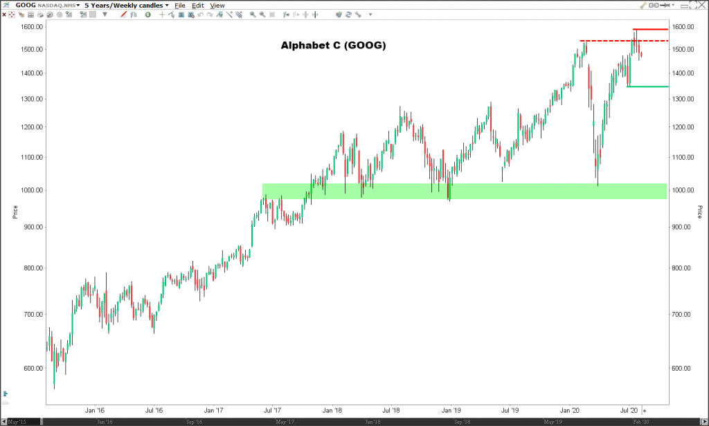 Po více než 30% koronavirovém propadu byla cena akcií Alphabet odpružena podpůrnou zónou kolem 1 000 $. Cena zde byla v posledních letech několikrát vyzvednuta, a proto tato podpora tvoří pro akcie pevné dno.V poslední době se cena silně zotavila, a dokonce se vytvořilo nové historické maximum.Úlomek nad předchozím únorovým maximem však akcie neudržel.Pokles pod poslední vrchol může být považován za falešný útěk.