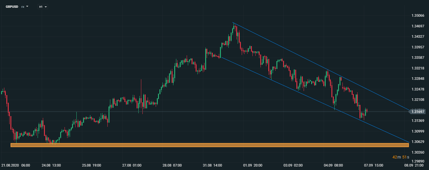 Menový pár GBPUSD sa obchoduje v lokálnom klesajúcom trende. V prípade, ak bude aj naďalej rásť riziko brexitu bez dohody, menový pár by sa mohol v najbližších dňoch dostať k supportu úrovni 1,3050. Zdroj: xStation5