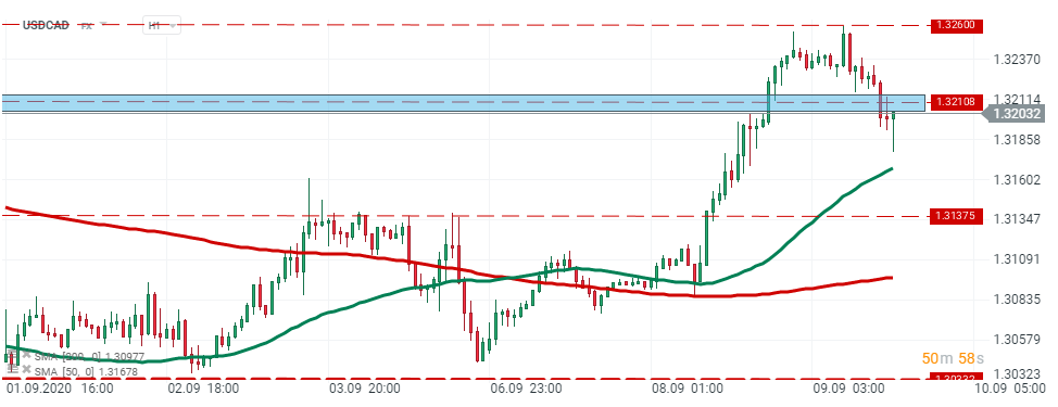 USDCAD - menový pár pôvodne klesol po dnešnom rozhodnutí o úrokových sadzbách BoC, kupujúcim sa však darí rýchlo znovu získať kontrolu nad trhom a cena v súčasnosti testuje úroveň rezistencie 1,3210. Zdroj: xStation5