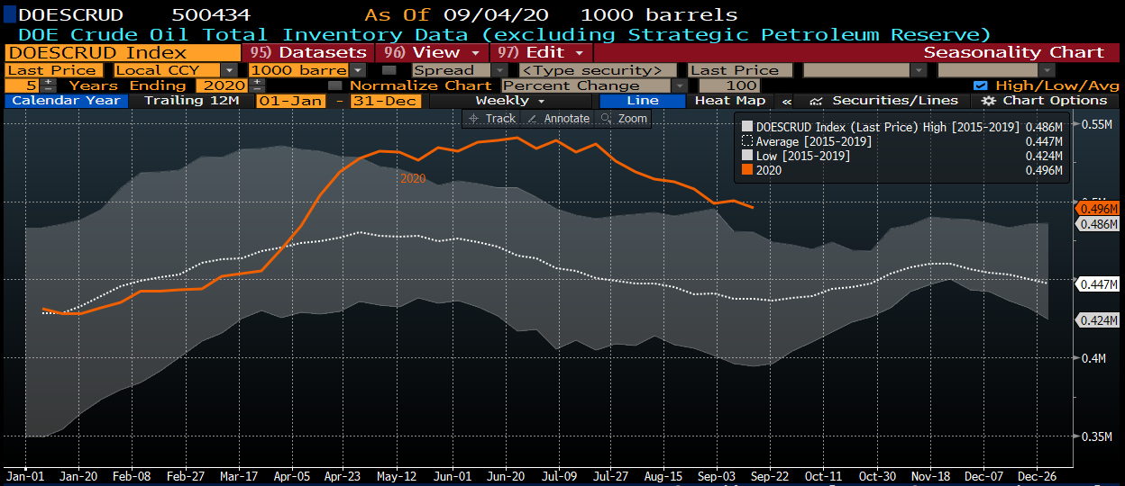 Zásoby ropy: –2,4 mil. barelů (odhad: –2 mil.). Benzín: –1,3 mil. barelů (odhad: –1,6 mil.). -