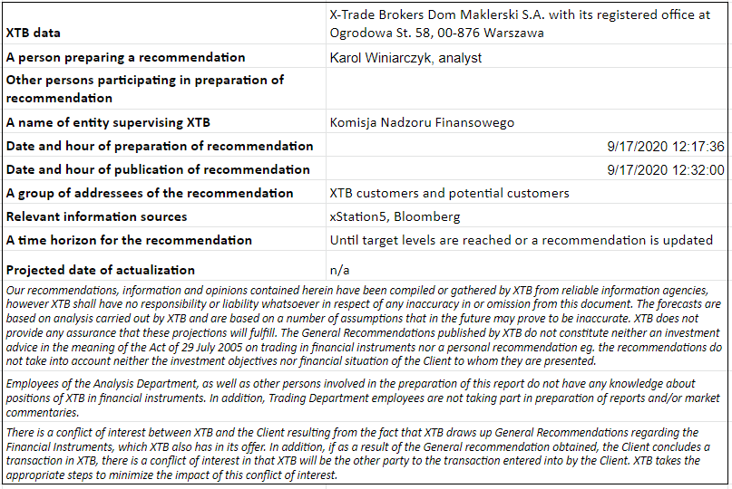 Australský dolar je jednou z nejslabších měn v průběhu dnešní seance. Riziková averze se vytratila po včerejším zasedání Fedu, který trhům nenabídl dodatečný stimul. OECD v noci zveřejnila nový ekonomický výhled. Očekává, že se australská ekonomika nevrátí na předkoronavirové úrovně do roku 2022. Australská míra nezaměstnanosti klesla v srpnu nečekaně na 6,8 %. Jedná se o nejnižší míru nezaměstnanosti od dubna. Další signály z trhu práce však naznačují, že oživení na trhu práce bude delší, než se čekalo. Z technického pohledu pár prorazil spodní limitu trojúhelníkové formace, která byla navíc posílena 50 denním klouzavým průměrem (zelená čára). Doporučujeme short pozici na páru AUDJPY za market s dvěma cílovými cenami: 75,10 a 74,05. Stop loss umisťujeme na 77,26.
