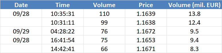 Největší obchody podle objemu na EURUSD (aktivní future kontrakt):