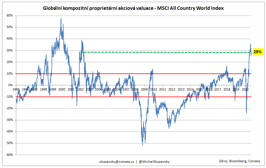 Co se globálního akciového výhledu týče, na konci září jsme se rozhodli akcie v našich investičních portfoliích podvážit. Vedli nás k tomu primárně tři důvody: 1) Solidní výkonnost globálních akciových trhů v letošním roce s přihlédnutím k masivním dopadům globální pandemie, 2) Velmi vysoké akciové valuace neboli akciové ocenění, nejvyšší od roku 2002 a 3) Extrémně nejistý globální makroekonomický výhled.