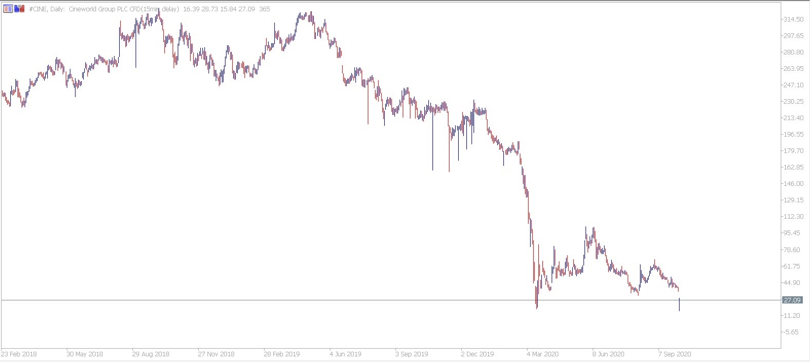 Zdroj: Admiral Markets MetaTrader 5 . Cineworld denní graf. Rozsah dat: od 23. února 2018 do 5. října 2020. Připraveno 5. října 2020 ve 12 hodin. Pamatujte, že minulé výnosy nezaručují budoucí výnosy.
