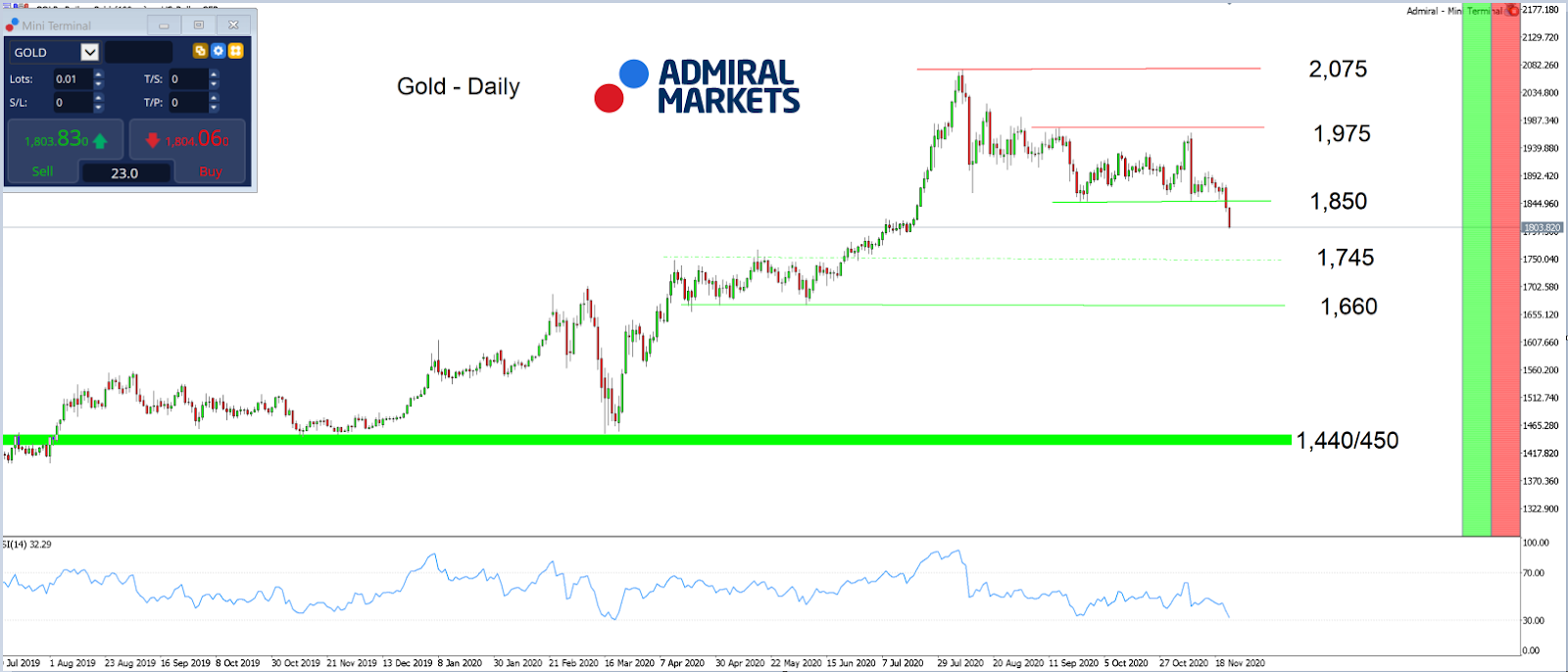Zdroj: Admiral Markets MT5 s MT5SE Add-on GoldDaily chart (od 10. července 2019 do 24. listopadu 2020). Přístup: 24. listopadu 2020, v 22:00 GMT. Poznámka: Minulá výkonnost není spolehlivým ukazatelem budoucích výsledků nebo budoucí výkonnosti.