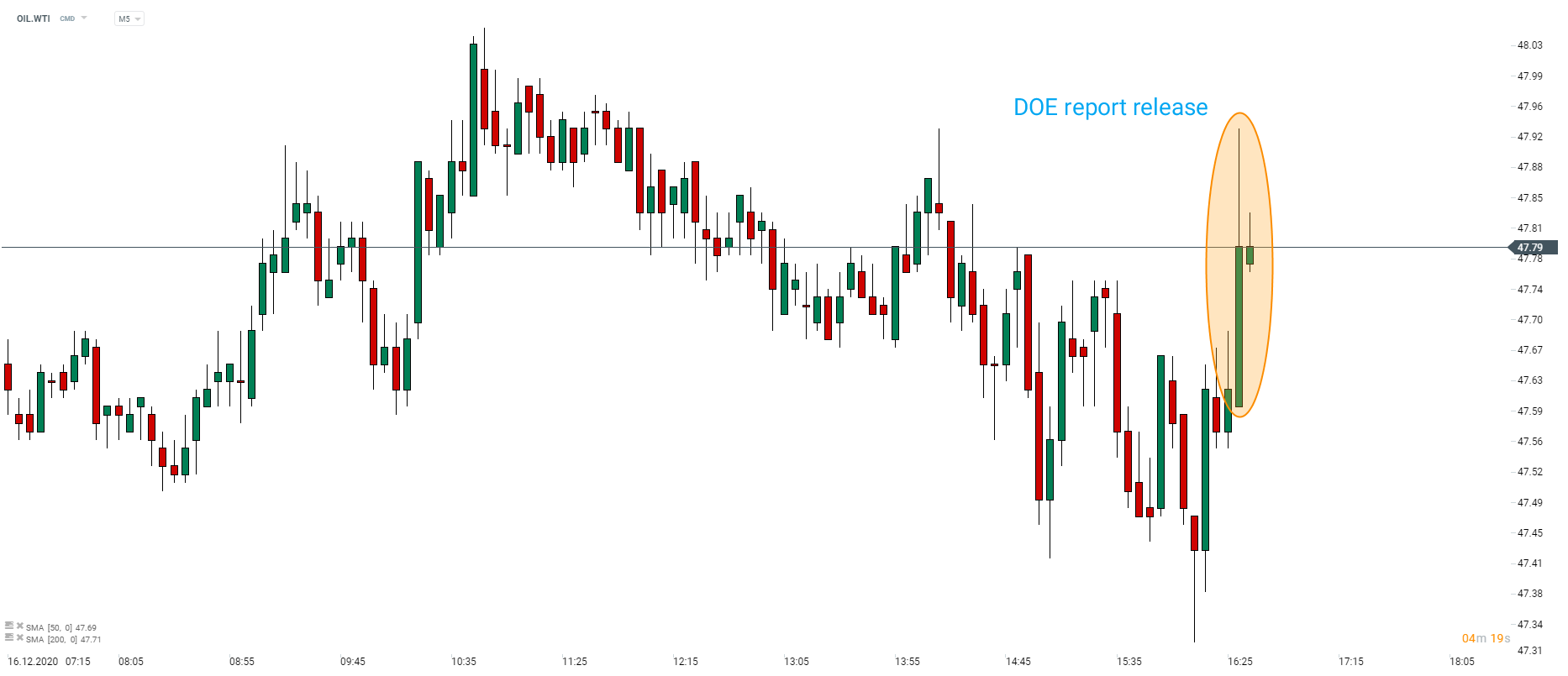 OIL.WTI zaznamenala po zverejnení údajov o zásobách nárast. Komodita sa však stále obchoduje pod úrovňou denného maxima, ktorá sa nachádza okolo úrovne 48 dolárov. Zdroj: xStation5