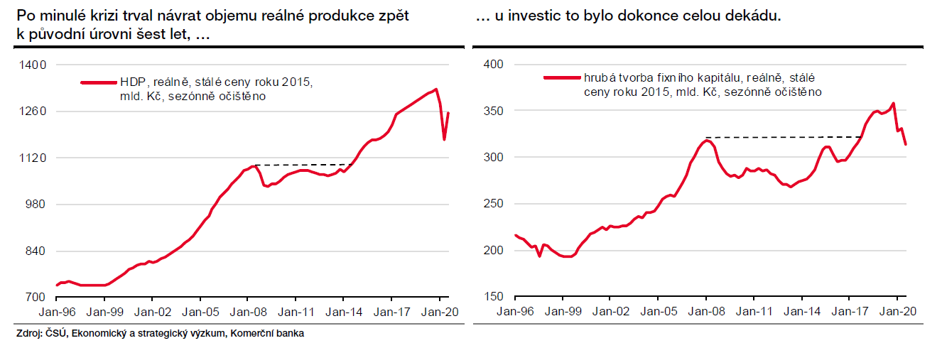 Kolik nás stála blbá nálada v předchozí krizi? Připomeňme, že na předkrizovou úroveň třetího čtvrtletí roku 2008 se česká ekonomika v objemu reálné produkce dostala až po šesti letech. Pokud jde o investice v podobě tvorby hrubého fixního kapitálu, ty samozřejmě reagovaly dříve, předkrizového vrcholu dosáhly o půl roku dříve, tedy v prvním kvartále 2008. Návrat zpět na tuto úroveň pak trval celou dekádu.
