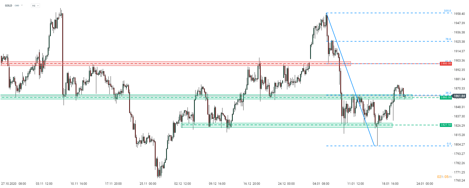 Pozitivní korekce na trhu se zlatem si dala pauzu a kov ztratil část svých nedávných zisků. Nyní jsme svědky otestování zóny 38,2 % retracementu posledního poklesu (oblast $1 860). V případě, že se býkům podaří ubránit tuto technickou úroveň, tak jejich první cíl bude oblast okolo kulaté hladiny $1 900, kde se zároveň nachází 61,8 % retracement posledního poklesu. Pokud cena naopak protne zónu support $1 860, tak může zamířit k další podpoře na $1 827,50.
