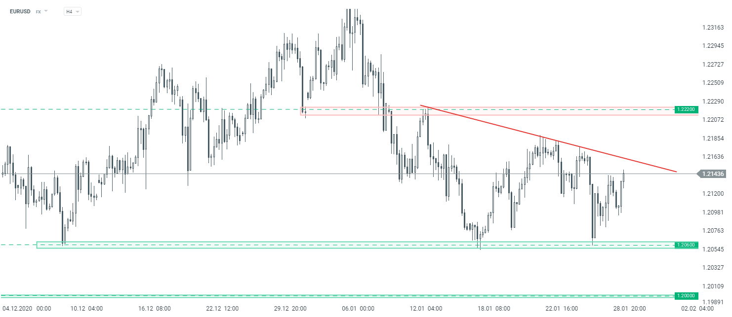 Trhy výraznejšie nereagovali na zverejnenie údajov. Pokiaľ ide o EURUSD, oblasť s hodnotou 1,2060 zostáva kľúčovou krátkodobou podporou (miestne minimá). Dôležitý odpor možno nájsť na hodnote 1,2220. Zdroj: xStation5