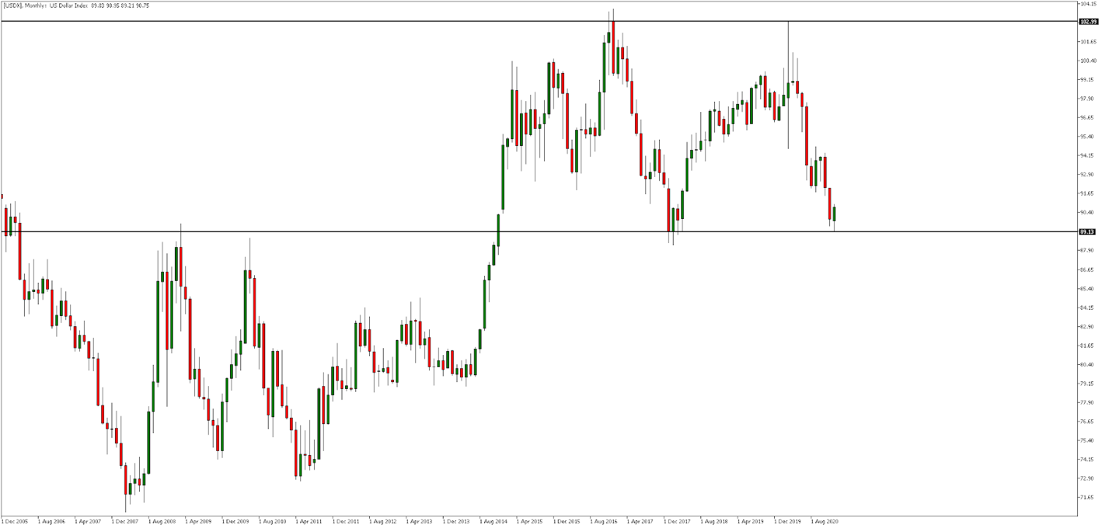 Zdroj: Admiral Markets MetaTrader5, USDX, Měsíční graf (od od 1. prosince 2005 do 29. ledna 2021). Provedeno 29. ledna 2021 ve 19:00 hodin. Vezměte prosím na vědomí, že zisk z předchozího období není spolehlivý indikátor budoucích zisků nebo pohybů ceny.