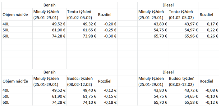 Analytik spoločnosti X-Trade Brokers, Lukáš Lipovský, na základe vývoja cien PHM v Rotterdame očakáva, že ceny benzínu a dieslu by mali byť v priebehu dvoch až troch týždňov približne na súčasných úrovniach. Priemerné ceny benzínu na Slovensku sa behom minulého zvýšili o 2 centy za liter, pričom priemerné ceny dieslu vzrástli o 1,9 centu za liter oproti priemerný cenám z predchádzajúceho týždňa.