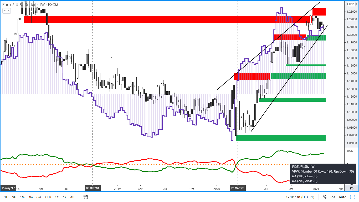 - Fialová čáraa histogramv okně grafu: informace o celkové čisté pozici velkých spekulantů.