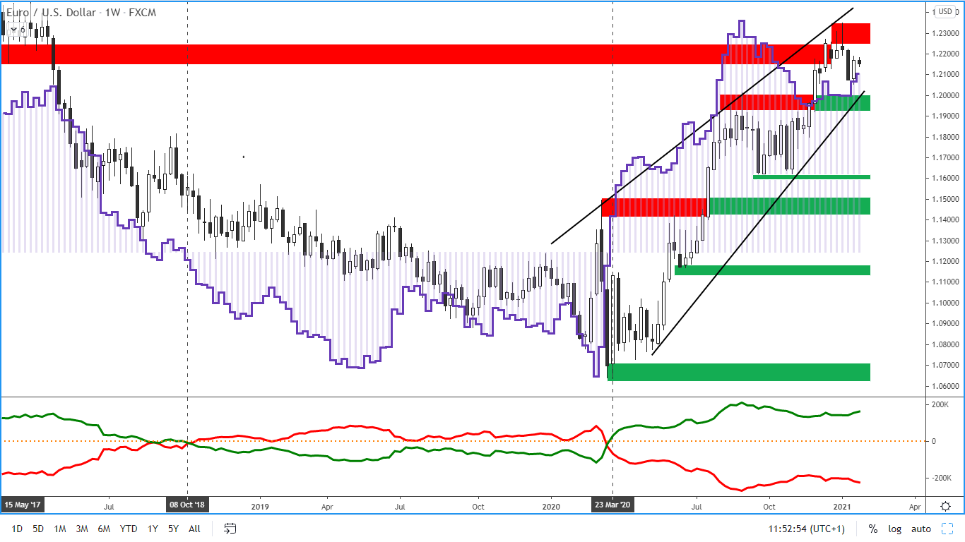 - Fialová čáraa histogramv okně grafu: informace o celkové čisté pozici velkých spekulantů.