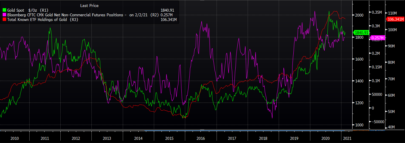 Nedostatok väčšej volatility zlata v porovnaní s inými drahými kovmi súvisí s veľkosťou trhu. Trh s platinou, ktorý je minimálne niekoľko desiatokkrát menší, sa dá ľahšie posunúť ďalej. Ak sa však vyskytnú obavy z inflácie, najviac by z toho mal vyťžiť trh so zlatom. Stojí za zmienku, že množstvo zlata v trezoroch ETF sa od začiatku roka výrazne nezmenilo. To je relatívne dobrá správa, pretože to znamená, že investori nevyberajú finančné prostriedky. Zdroj: Bloomberg