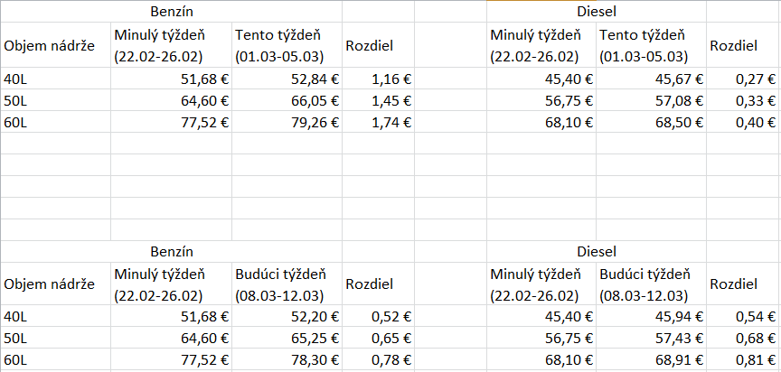 Analytik spoločnosti X-Trade Brokers, Lukáš Lipovský, na základe vývoja cien PHM v Rotterdame očakáva, že ceny benzínu a dieslu by mali zaznamenať v priebehu dvoch až troch týždňov nárast od dvoch do troch centov za liter oproti priemerným cenám z predchádzajúceho týždňa. Priemerné ceny benzínu a dieslu na Slovensku sa behom minulého zvýšili o 1,9 centu za liter oproti priemerný cenám z predchádzajúceho týždňa.