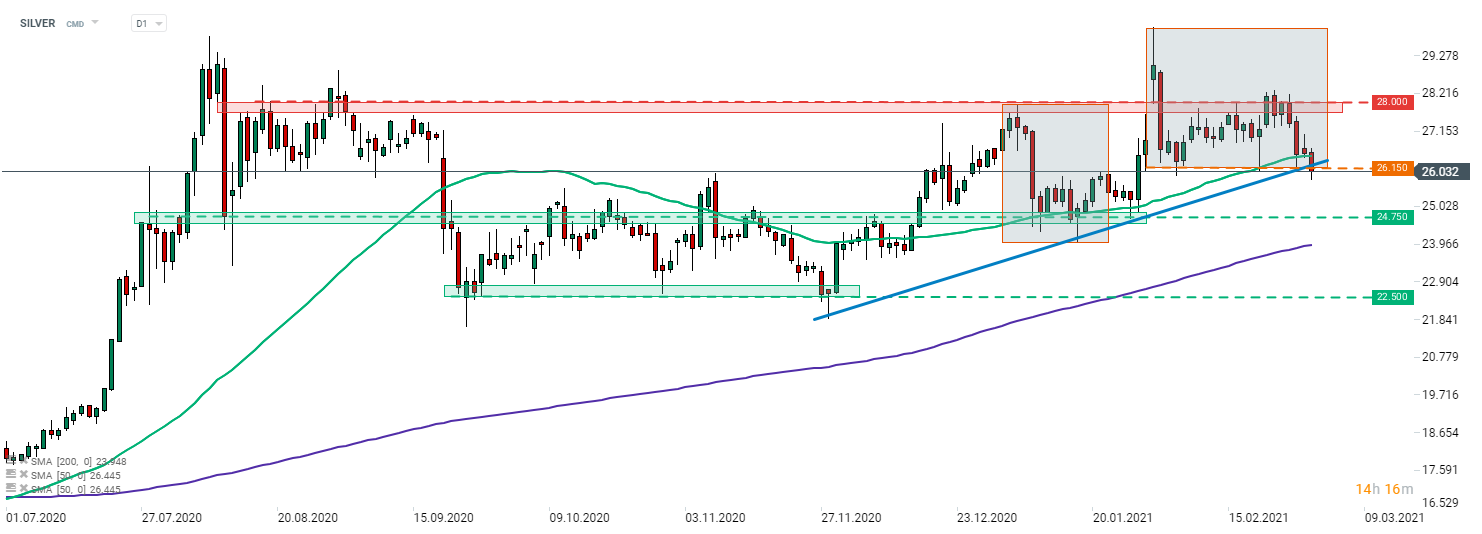 Striebro pokračuje vo výpredaji, ktorý sa začal minulý týždeň, keď si americký dolár opäť upevňuje pozíciu. Cena za posledné 4 obchodné dni poklesla takmer o 7% a dnes dosiahla dôležitú podporu. Striebro testuje dolnú hranicu štruktúry Overbalance na úrovni 26,15 USD a stúpajúcu trendovú líniu. Uzatvorenie dennej sviečky pod touto prekážkou možno považovať za signál krátkodobého obrátenia trendu. V takomto scenári možno ďalšiu sledovanú podporu nájsť v strednodobej cenovej zóne na úrovni 24,75 USD.