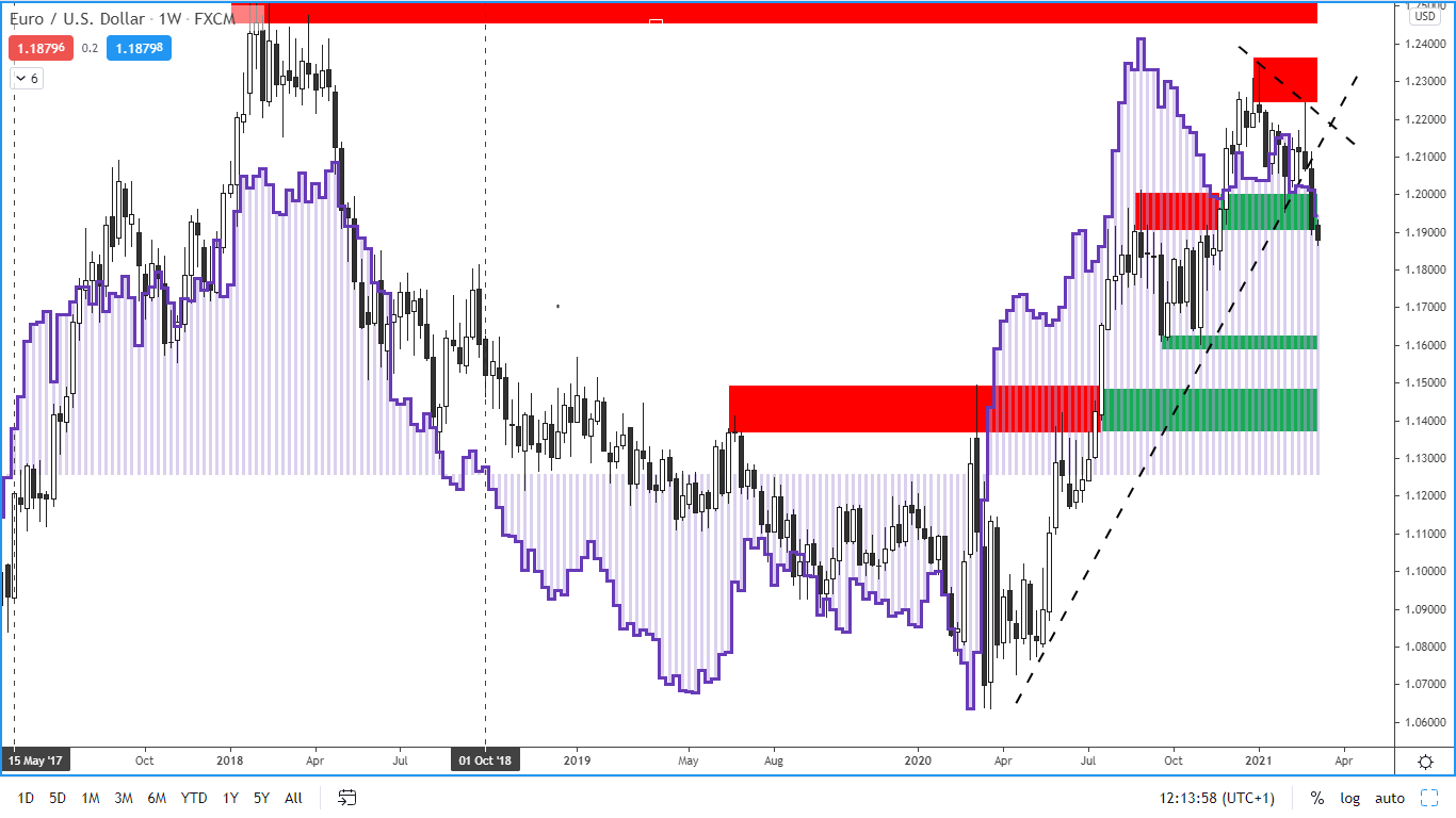Cena eura minulý týden pokračovala v poklesu, prorazila spodní trendovou linii a aktuálně směřuje do oblasti konsolidace v pásmu mezi 1.1600-1.1900.