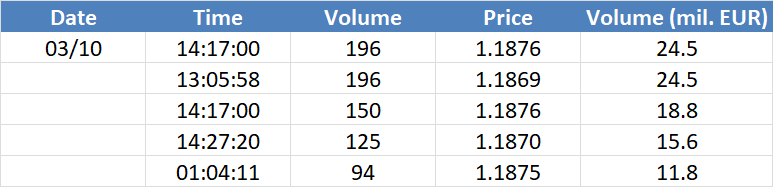 Největší obchody podle objemu na EURUSD (aktivní future kontrakt):