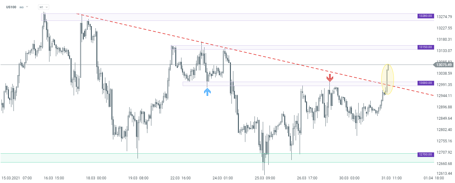 Zatiaľ čo v Európe dnes môžeme vidieť zmiešané alebo dokonca mierne horšie nálady, obchodovanie v zámorí začína ziskami. Na začiatku obchodovania v USA sa hlavné americké indexy zvyšujú. Obzvlášť dobre sa daríindexu Nasdaq (US 100), ktorý získal takmer 1,5%. Tech akcie profitujú z nedávneho poklesu výnosov amerických dlhopisov. Výnos na 10-ročných amerických dlhopisoch dnes klesol z 14-mesačného maxima (1,77%) na 1,72%. Pri pohľade na graf z technického hľadiska sa index prelomil nad silnou rezistenciou na úrovni 13 000 bodov. Ak prevládne aktuálny sentiment, pohyb smerom nahor by sa mohol rozšíriť na hladinou 13 150 bodov, alebo dokonca k odporu na úrovni 13 280 bodov.