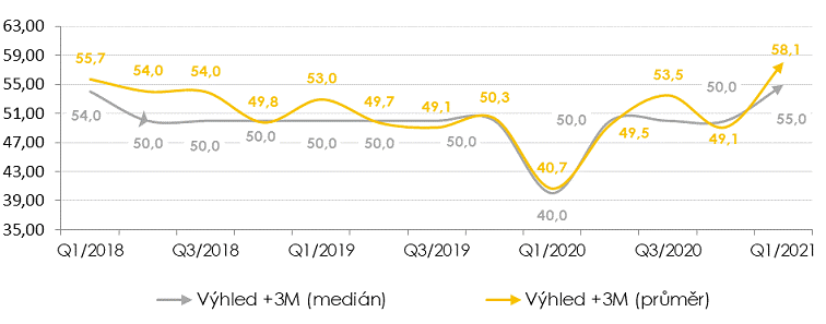 Povzbuzující zprávou jsou výrazně lepší vyhlídky do budoucna. Očekávání ohledně vývoje v následujících třech měsících se vyšplhala na nejvyšší průměrnou hodnotu od druhého čtvrtletí 2016. „Zda se tato velmi vysoká očekávání naplní, bude záviset na postupu v očkování nejen v České republice, ale i v zahraničí. Dalším důležitým faktorem bude doba přetrvávání nedostatku výrobního materiálu a dalších komplikací v dodavatelských řetězcích,“ komentuje David Vagenknecht.