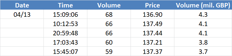 Největší obchody podle objemu na GBPUSD (aktivní future kontrakt): Největší denní objemy na trhu s měnovými futures. Na cenách, kde se včera objevily největší objemy, mohou být velcí hráči aktivní i dnes – zejména pokud se tyto ceny pohybují u některého ze včerejších high/low.