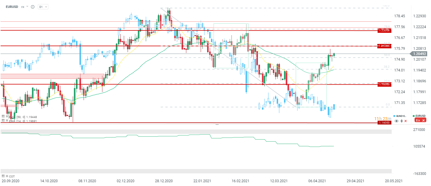 EURUSD sa včera odrazil a negoval potenciálnu tvorbu večernej hviezdy. Ako však vidno, po posledných 3 obchodných dňoch môže byť volatilita pomerne vysoká, najmä v prípade prekvapenia o 13:45 alebo otázok o tempe nákupu aktív po 14:30. Ako si môžeme všimnúť, ceny bundov sa snažia o oživenie, aj keď nedávne pohyby určite nie sú také silné ako v prípade amerických dlhopisov. Zdroj: xStation5
