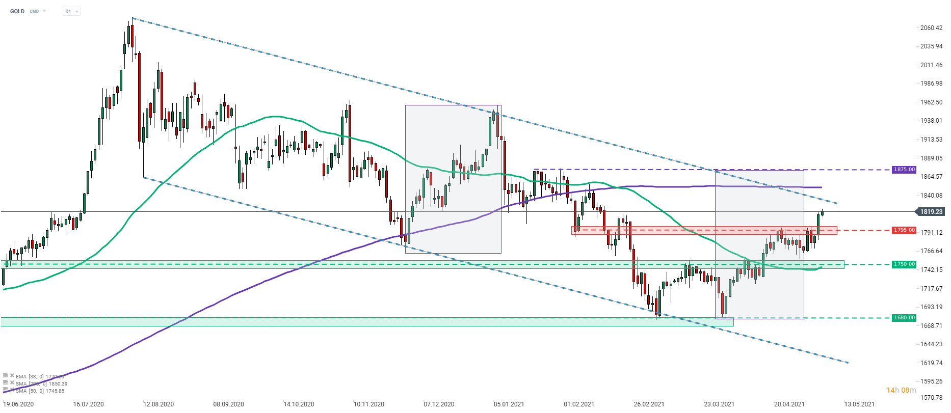 Po třítýdenním boji se včera zlatu podařil silný rostoucí pohyb a výskok nad úroveň $1 800/oz. Rostoucí pohyb pokračuje také dnes. Zlato testuje úroveň $1 820 - nejvyšší cenu od 16. února 2021. Hlavním důvodem pozitivního vývoje je oslabování USD a sazby v USA "pod kontrolou". Dne ve 14:30 bude zveřejněn NFP report z pracovního trhu USA. Může zvýšit volatilitu na dolaru a také na trhu se zlatem.