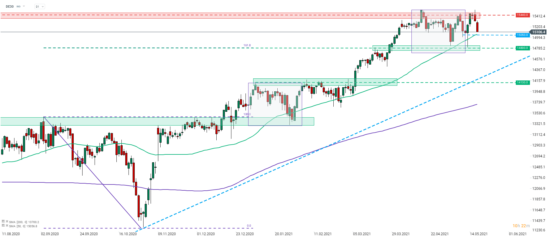 DE30 včera navýšil intradenní rekordy, nicméně následně se situace rychle zhoršila. Index dnes padá o 1,5 % a blíží se posledním lokálním minimům, kde se zároveň nachází 50 období klesající průměr v oblasti 15 050 bodů. Zdroj: xStation5