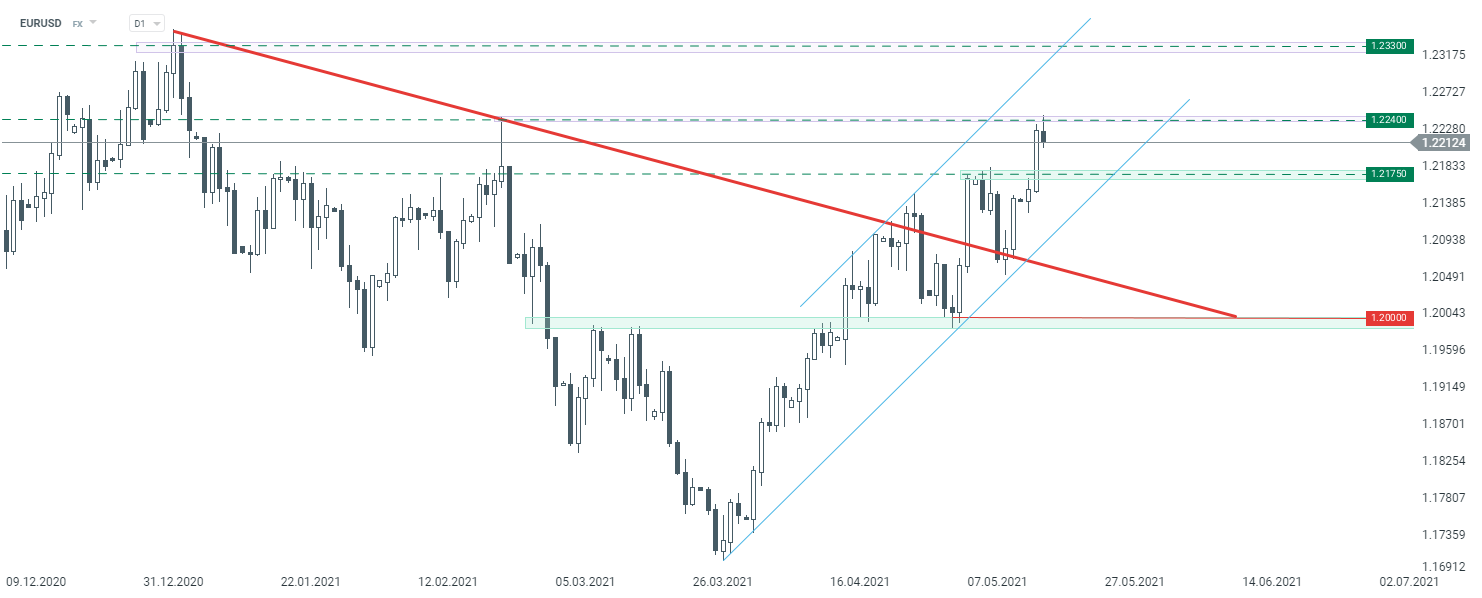Na denním grafu měnového páru vidíme, že se v poslední době obchodoval v rostoucím trendu. Býkům se podařilo prorazit nad klesající trendovou čáru (červená čára na grafu) na počátku května. Následně došlo k otestování trendové čáry a pár se vrátil k růstu. Býci nicméně ztratili momentum a rostoucí pohyb byl zastaven v oblasti rezistence na 1,2240. Pokud by došlo k výraznější klesající korekci, tak nejbližší support leží na úrovni 1,2175. V případě průrazu je spodní limita rostoucího kanálu (modrá čára) dalším důležitým supportem.
