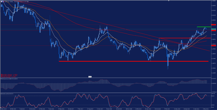 V případě měnového páru GBPUSD můžeme vidět, že tento pár sleduje velmi jasný vzestupný trend od 20. března 2020, kdy zaznamenal minima kolem úrovně 1.14100, až téměř k úrovni 1.42400, což vedlo k překročení jeho dlouhodobé klesající trendové linie (červeně).