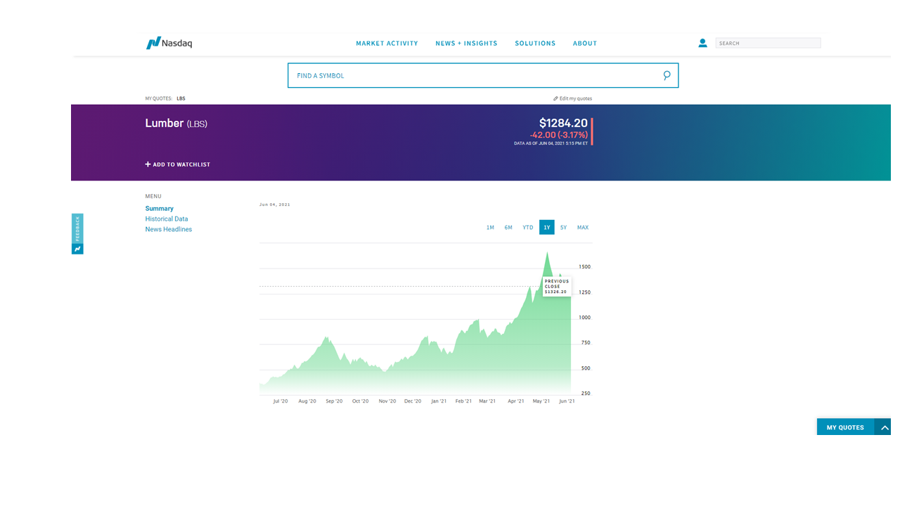 Cena stavebního dřeva na světových trzích prudce roste, i když v poslední době došlo ke korekci. Vývoj ceny dřeva za posledních 12 měsíců ukazuje graf ze 4. června 2021. Před rokem činila jednotková cena 350 dolarů za 2,35 metrů krychlových (1000 board feet), o rok později to bylo více než 3,5krát, tedy 1284 dolarů.