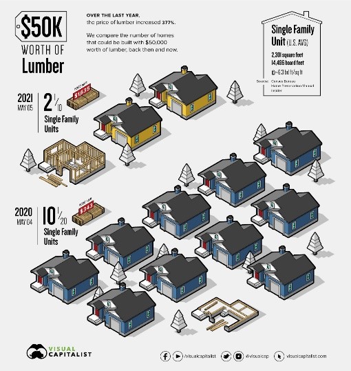 Efekt skokového zvýšení ceny je patrný na schématu zobrazující, na jaký počet výstavby samostatných rodinných domů by se dalo použít dřevo nakoupené za 50 tisíc amerických dolarů v květnu 2020 (modré domy) a květnu 2021 (žluté domy). Náklady na stavbu průměrného domu byly zvýšeny o 36 tisíc dolarů. V meziročním porovnání stejný finanční objem nyní postačuje pouze na pětinu nemovitostí.
