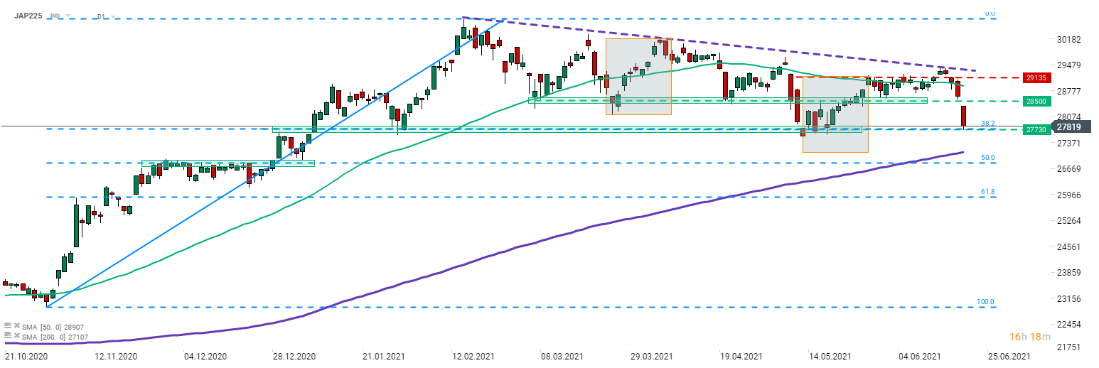 Nikkei (JAP225) pod prodejním tlakem. Klesá až na support na 38.2 % fibo retracementu. Zdroj: xStation5