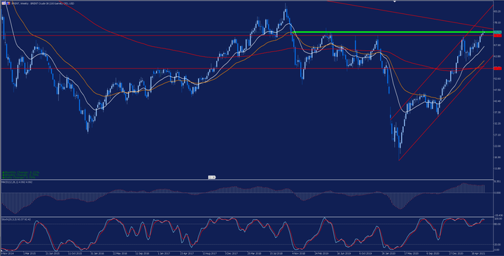 Zdroj: Admiral Markets MetaTrader 5. Týdenní graf ropy Brent. Rozsah dat: listopad 2014 až 21. červen 2021. Zpracováno 21. června 2021 ve 12:05 SELČ. Upozorňujeme, že minulé výnosy nezaručují budoucí výnosy.